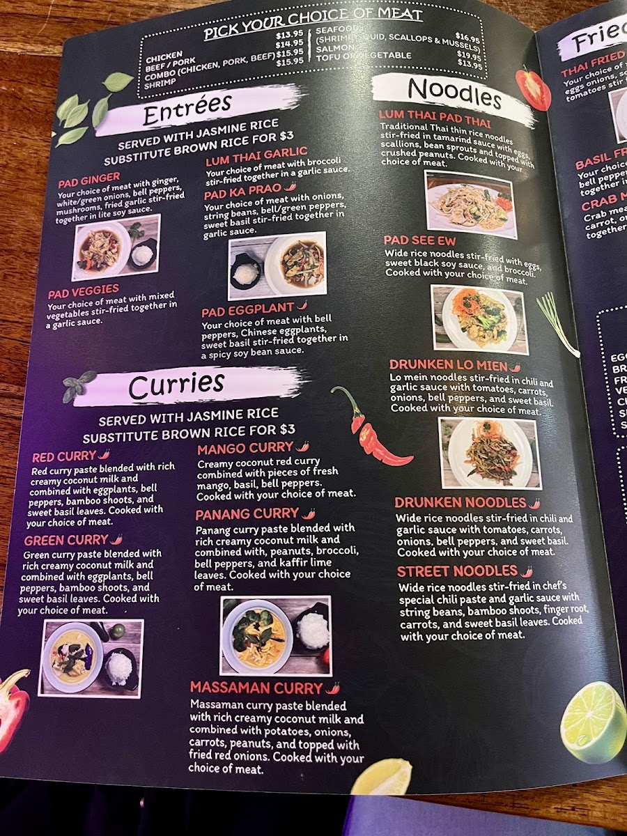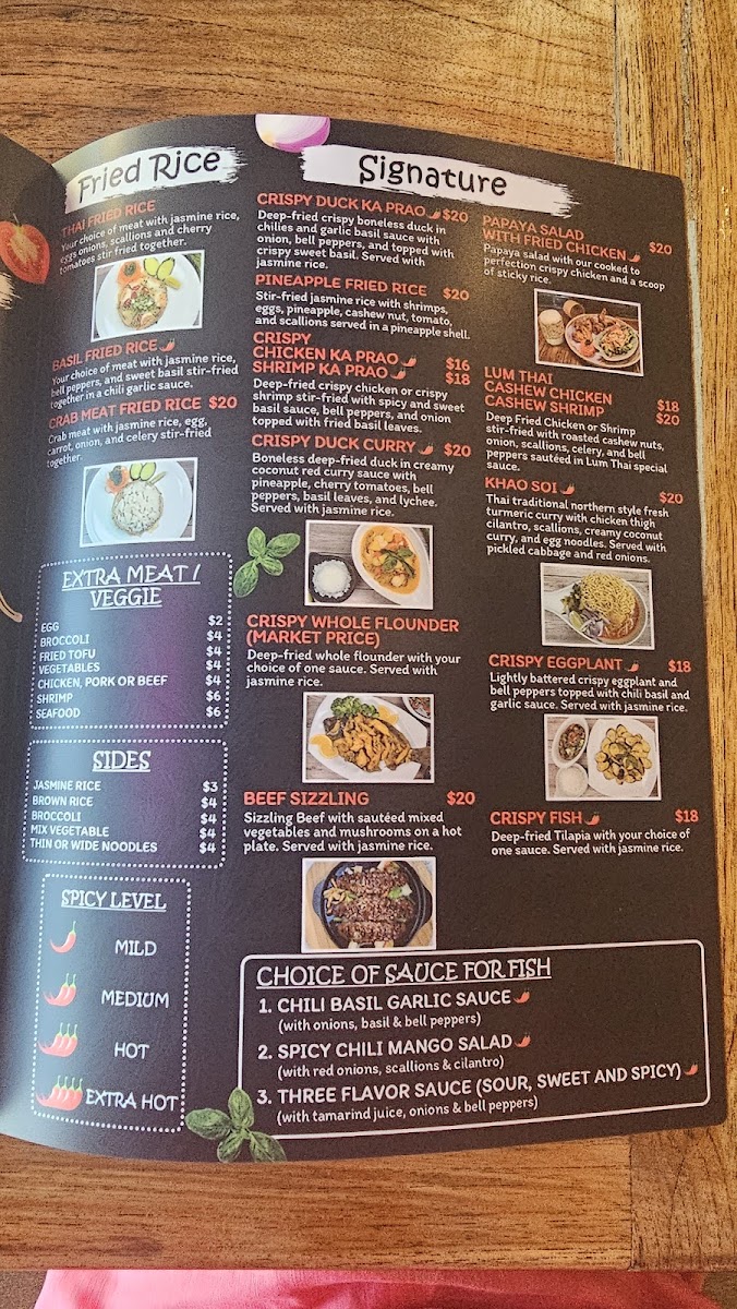 Welcome to LumThai, a culinary gem located in Gaithersburg, MD, known for its authentic Thai flavors and warm ambiance. The menu showcases an impressive selection of dishes that highlight fresh ingredients and traditional recipes. Start with the Thai Fried Rice, a harmonious blend of jasmine rice and vibrant vegetables, customizable with your choice of meat. For something truly special, don’t miss the Crispy Duck Ka Prao, featuring succulent deep-fried duck complemented by a fragrant chili and garlic basil sauce, served with jasmine rice.